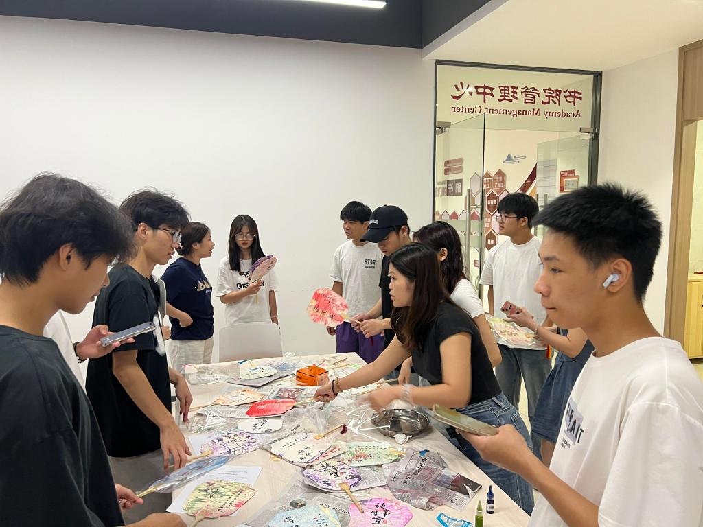 稍晚些,走入学思苑,各式各样的漆扇映入眼帘。同学们将作品铺在桌子上,利用室内通风条件自然干燥。活动结束后,不少人带着作品在书院合影,扇面反光与笑脸相映,成了当晚最生动的文化剪影。