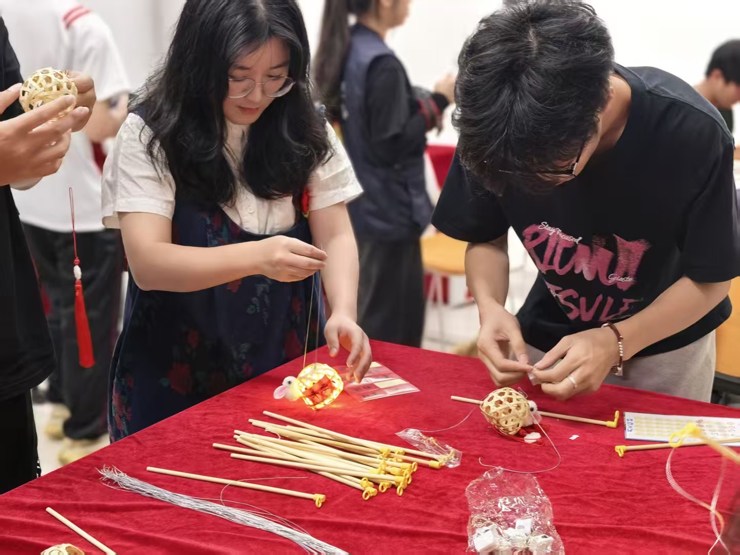 学思苑内,一盏盏鲤鱼灯笼材料静候巧手。同学们亲手制作鱼灯,点亮的不只是灯笼,更是对传统民俗的感知与热爱。完成制作即可兑换“月宝”,现场氛围温馨而浓厚。