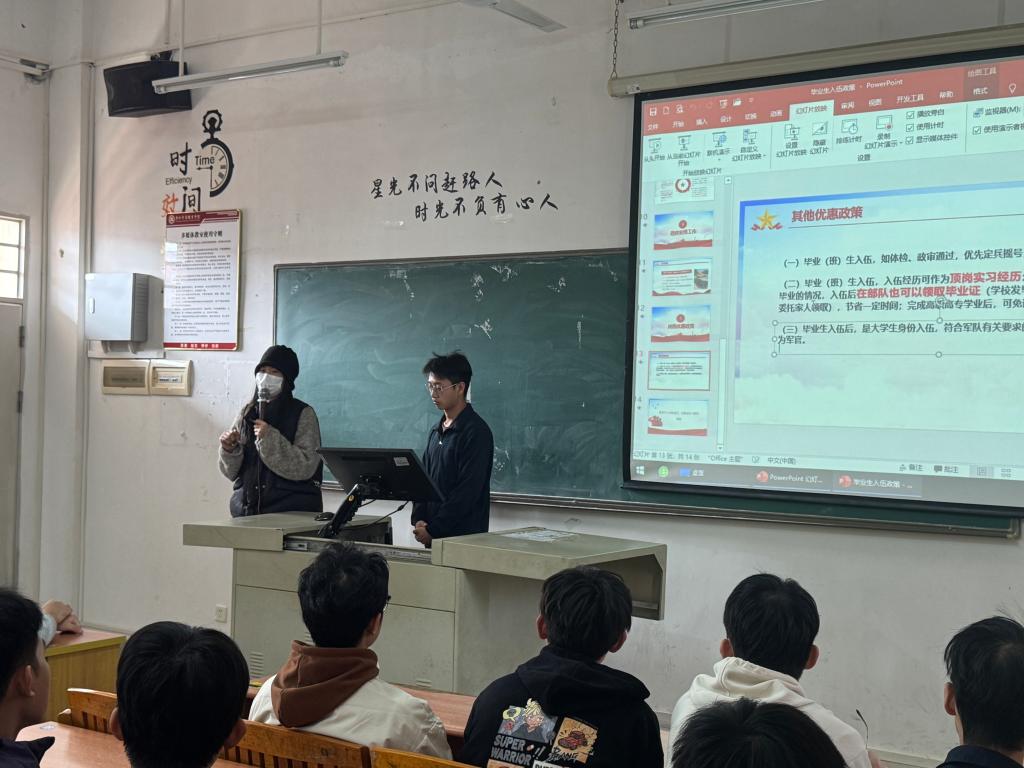 宣讲会上,退役学生服务队骨干成员首先对应征入伍的具体条件、报名流程及优待政策进行了系统梳理。讲解不仅涵盖了政治考核、体格检查等基本要求,更重点结合毕业生关心的学业发展与职业规划,详细解读了学费补偿代偿、考研加分、专升本优惠、公务员及事业单位定向招录等优待政策。为使讲解更具针对性,主讲人特别以增城区入伍政策为例,通过详实案例分析,让同学们对经济补助、退役安置等关键信息有了清晰认识。