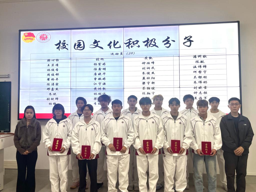 王子君老师以清晰而有力的声音宣读了表彰决定,对优秀个人及集体给予了高度认可与赞扬。大会进入庄重而热烈的表彰环节。为树立榜样标杆、激发奋进动力,经学院综合评议、严格筛选,最终确定表彰名单。老师们依次为在校园文化建设中积极参与、主动奉献,以实际行动丰富校园氛围的“校园文化积极分子”;以及在“广汉篮球杯”赛事中不畏强手、奋勇拼搏,凭借默契配合与顽强斗志为学院争光的获奖队员颁发荣誉证书与奖品。闪光灯下,获奖同学脸上洋溢着自豪的笑容,台下响起经久不息的掌声,既是对获奖者的诚挚祝贺,也是对全体学子勇于挑战自我、积极投身校园建设的肯定与鼓励。获奖代表在发言中表示,这份荣誉不仅是个人努力的见证,更承载着学院的信任与期望,未来将以更高标准要求自己,发挥榜样带头作用,带动身边同学共同进步,为学院发展贡献更多青春力量。