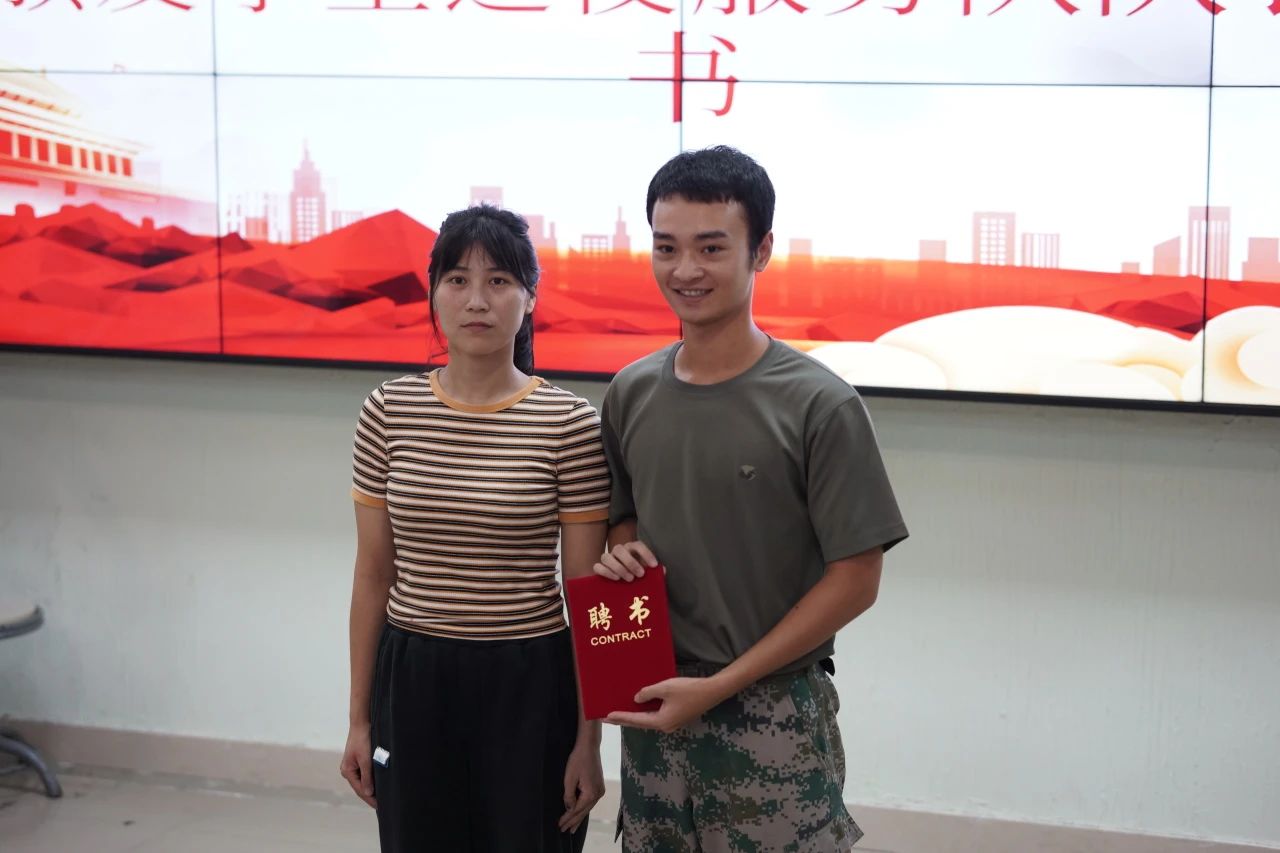 学院学工助理张蒙莉老师颁发学生退役服务队队长聘书。