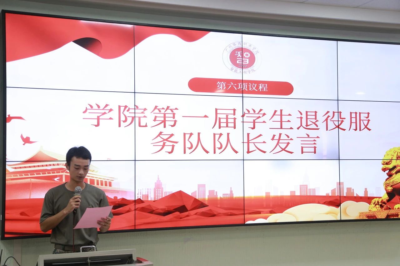 第一届学生退役服务队队长冯奕俊同学作代表发言。他承诺秉承以军人风范服务学生为宗旨,传承军人优良作风,退伍不褪色,积极做好表率,为学院学生退役服务队作出贡献。