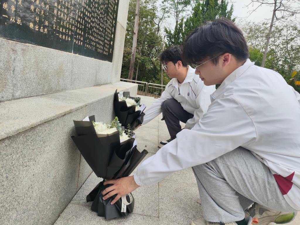 随后,同学们有序地迈着缓慢而坚定的步伐,将手中的朵朵菊花充满敬意地放置在纪念碑旁,向革命先烈们致以最崇高的敬意和最深切的缅怀。一朵朵素净的鲜花,承载着后来者永不褪色的记忆与承诺,在春风中诉说着英烈精神生生不息。