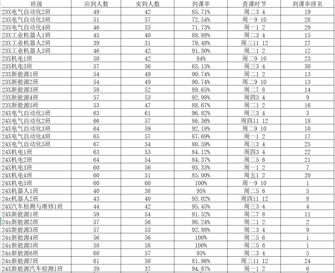 广汉书院团委工作人员对智能制造与汽车学院(江门校区)第五周的学生课堂情况和学生到课率进行了统计。现将第五周的查课数据汇总结果给予公布。