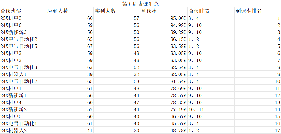 第五周的查课汇总到这里就结束啦,辛苦各位查课的工作人员,也感谢各班班委的支持和配合,望各位同学按时上课,认真学好每一堂课。
