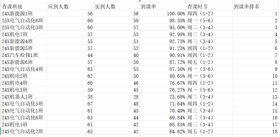 智能制造与汽车学院团委工作人员对智能制造与汽车学院(江门校区)第九周的学生课堂情况和学生到课率进行了统计。