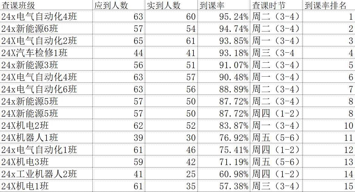 智能制造与汽车学院团委工作人员对智能制造与汽车学院(江门校区)第十一周的学生课堂情况和学生到课率进行了统计。