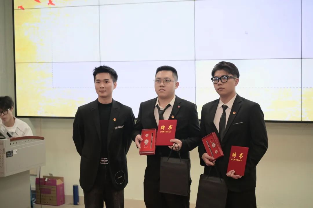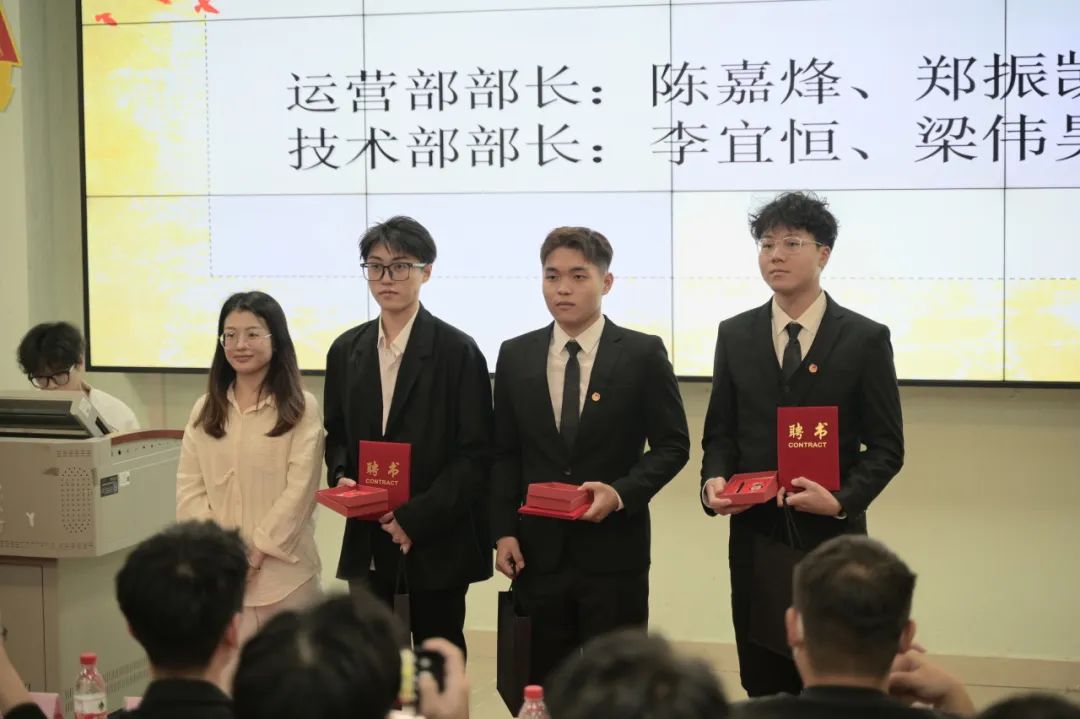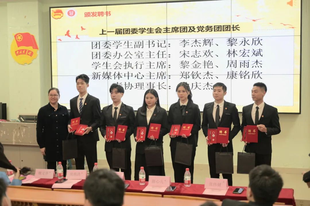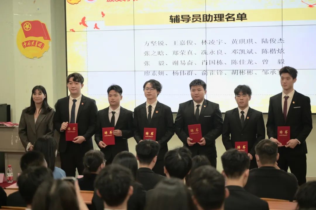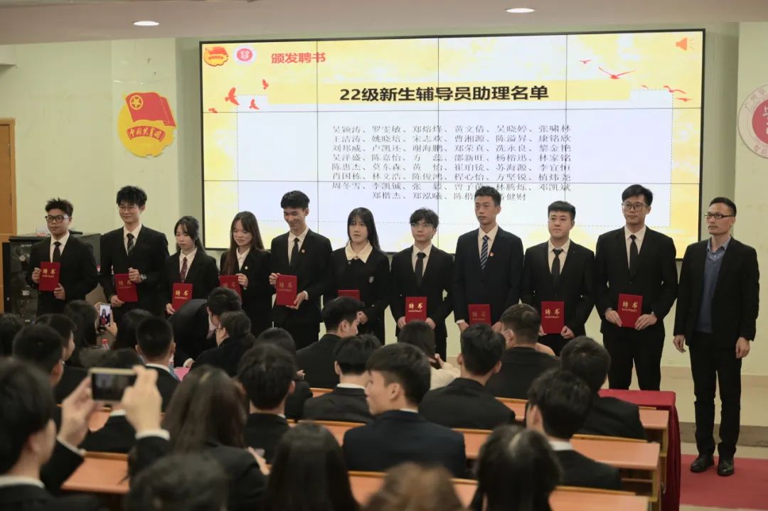 参会领导与老师为21级团委主席团、21级团委部长团、新生辅导员助理和辅导员助理颁发聘书。