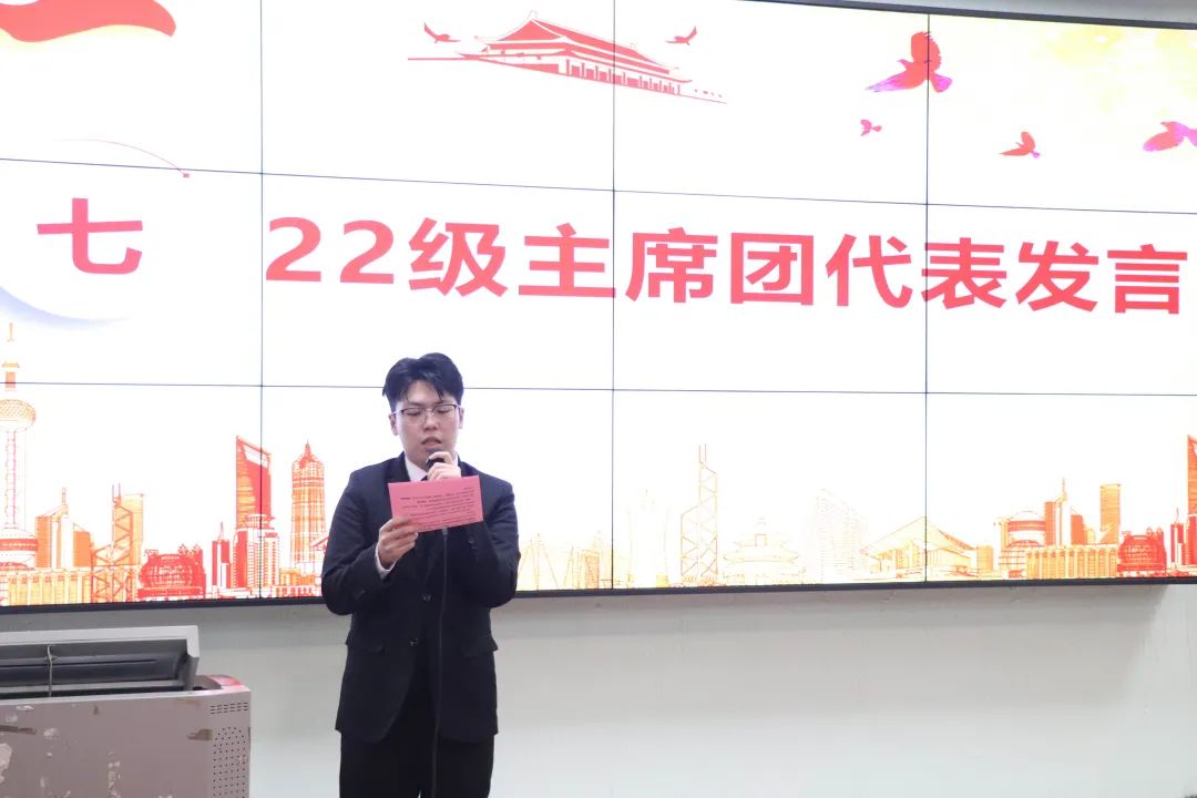 22级主席团代表邹承宪在发言中表示,十分感激各位领导老师的信任与栽培及师兄师姐们的关怀,他会继续延续他们奋斗过的足迹,他坚信只要大家凝心聚力,砥砺前行,必将续管院新的辉煌篇章,必定会绽放出更加夺目的光芒!