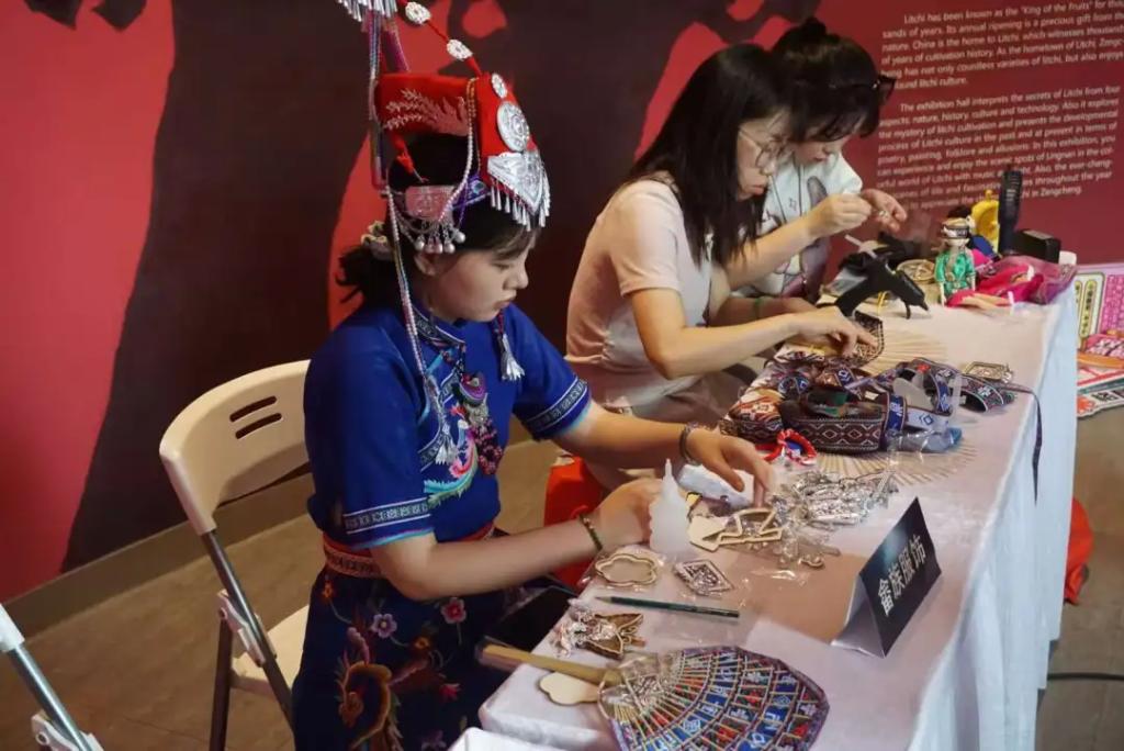 队员们走进荔枝博览馆,开启了一场甜蜜的"荔"想之旅。馆内满墙的科普知识令人大开眼界,从荔枝品种分类到千年种植历史,从生长习性到营养价值,系统性的介绍让队员们惊叹"原来荔枝还有这么多学问"。参观过程中,队员们还通过直播镜头,向观众实时分享在荔枝博览馆的所见所闻同DIY制作充满畲族文化饰品。这场别开生面的"云游荔枝园"直播,既传播了荔枝文化,也让更多人领略到畲族文化的独特魅力。