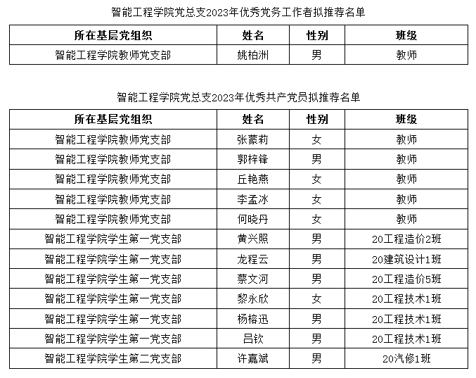 根据《中共广州华商职业学院委员会关于开展评选先进基层党组织、优秀共产党员优秀党务工作者的通知》,经党员个人申请,学生第一党支部、第二党支部、教师党支部讨论研究,报学院党总支审批同意,拟推荐姚柏洲同志为优秀党务工作者,张蒙莉等12名同志为优秀共产党员,现将名单予以公示。