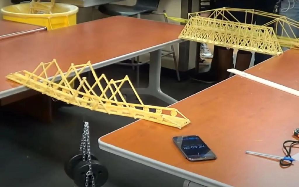 (4)承重竞赛方式:比赛现场,各参赛桥梁将被架设于两桌之间设定的固定距离上。裁判将按照预设程序,逐步增加砝码,直至桥梁达到其最大承载极限。比赛成绩以桥梁成功承受的最大重量为准,以此决出各赛道的承重冠军。此项测试不仅关注桥梁的绝对承载力,更深入考察其结构强度、整体稳定性以及设计的科学合理性。
