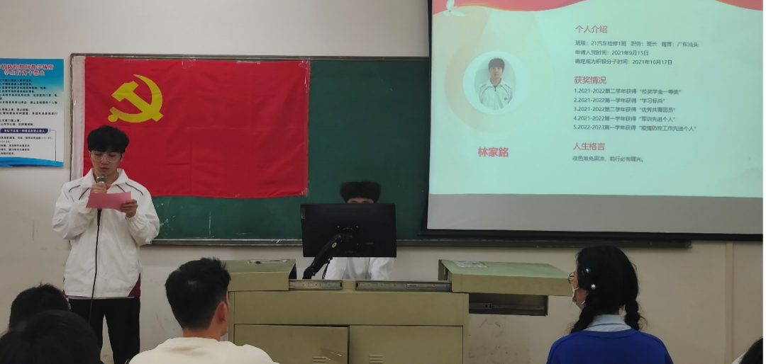 黄文倩等9名发展对象依次上台向党组织客观汇报考察期间个人在学习、工作、生活及思想等方面的表现,正式向党支部提出通表申请,表明加入中国共产党的决心。