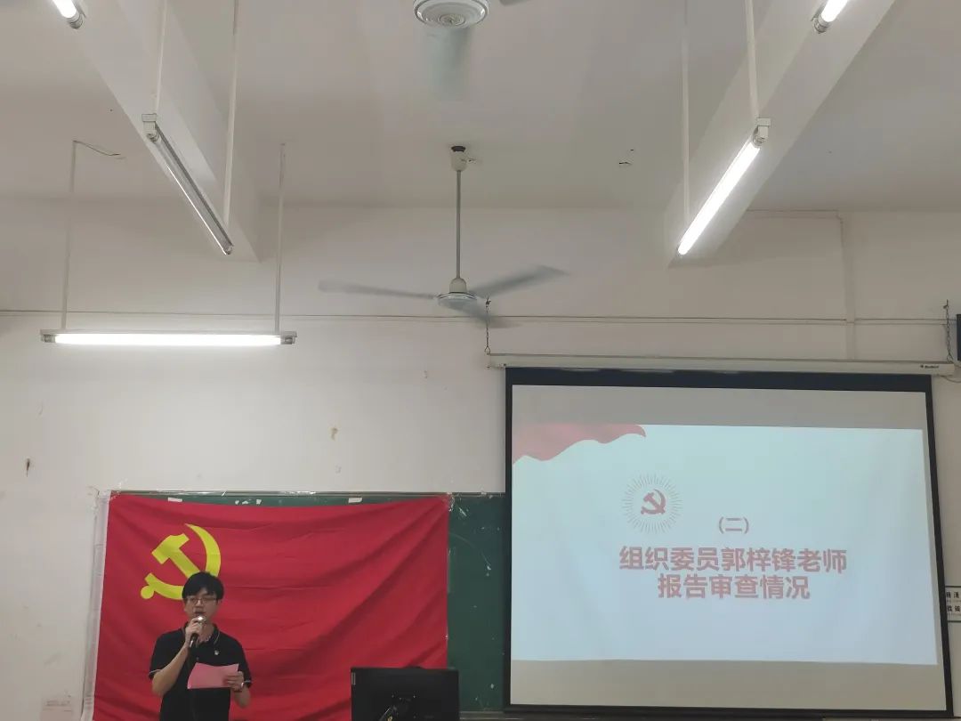 支部委员郭梓锋同志代表支部委员会报告了对程智俭等10名发展对象的政治审查情况合格、10名同志思想品质良好、入党动机端正、入党材料、内容产全、手续完善,同意履行入党手续。