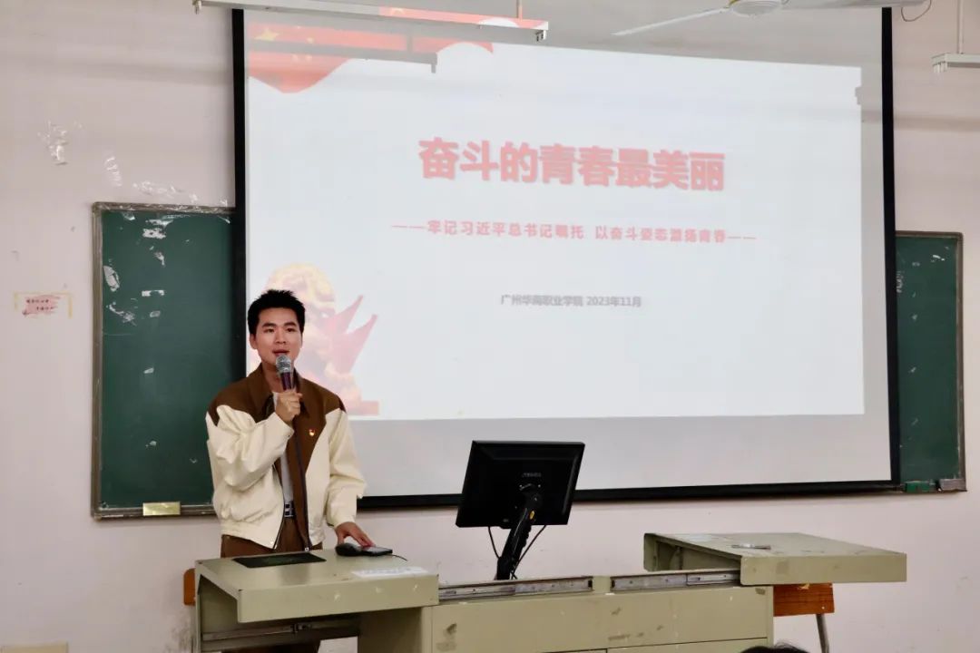视频学习过后,陈泽鑫老师带领在场同学重温习近平总书记对青年的一系列青春寄语,并对在场同学们提出四点要求。第一,做有理想的青年,自觉沿着习近平新时代中国特色社会主义思想指引的方向奋勇前进;第二,做敢担当的青年,在党和人民最需要的时刻冲得出来、顶得上去;第三,做能吃苦的好青年,在敢于斗争、善于斗争中展现刚健有为的精神风貌;第四,做肯奋斗的青年,在实现中华民族伟大复兴的接力跑中永久奋斗、团结奋斗。