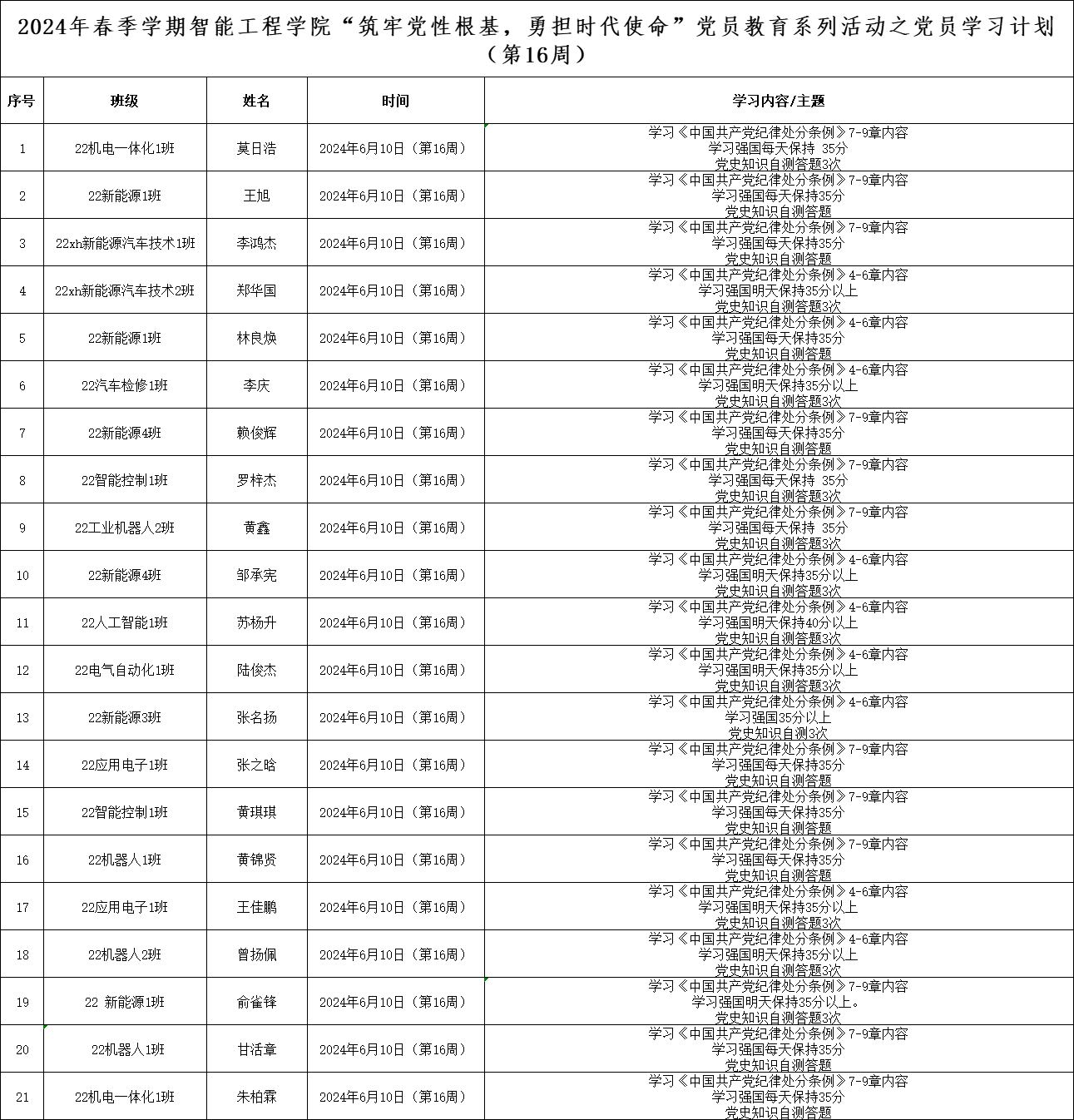 第十六周学生党员学习计划表