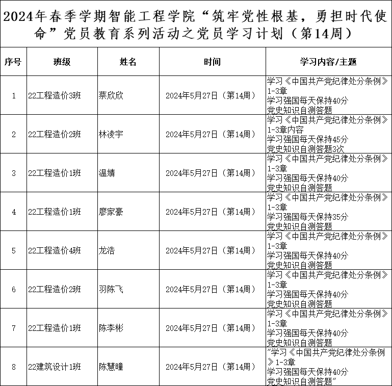 为深化党员的自我教育管理模式,切实提升党员自我教育管理实效,best365官网登录入口党总支针对现阶段党员教育管理不足现状,积极探索,组织开展党员自我教育学习活动,锚定学习目标,认真贯彻落实,狠抓推进整改,抓好奖励惩罚。现将第十四周党员学习计划及检查结果公布如下。
