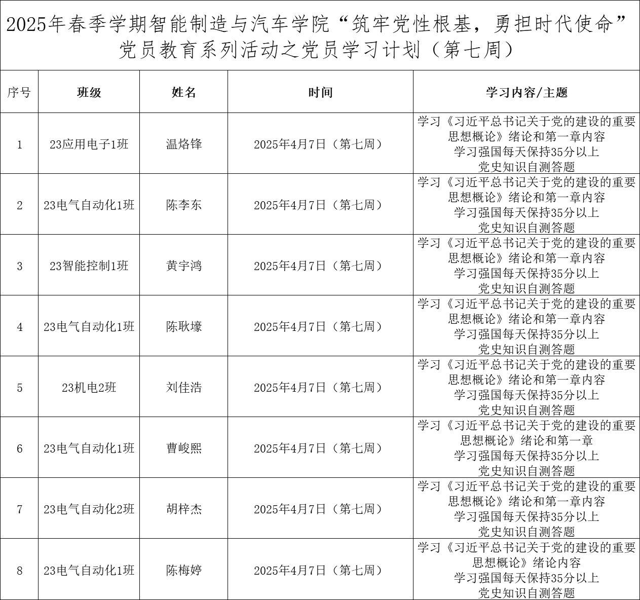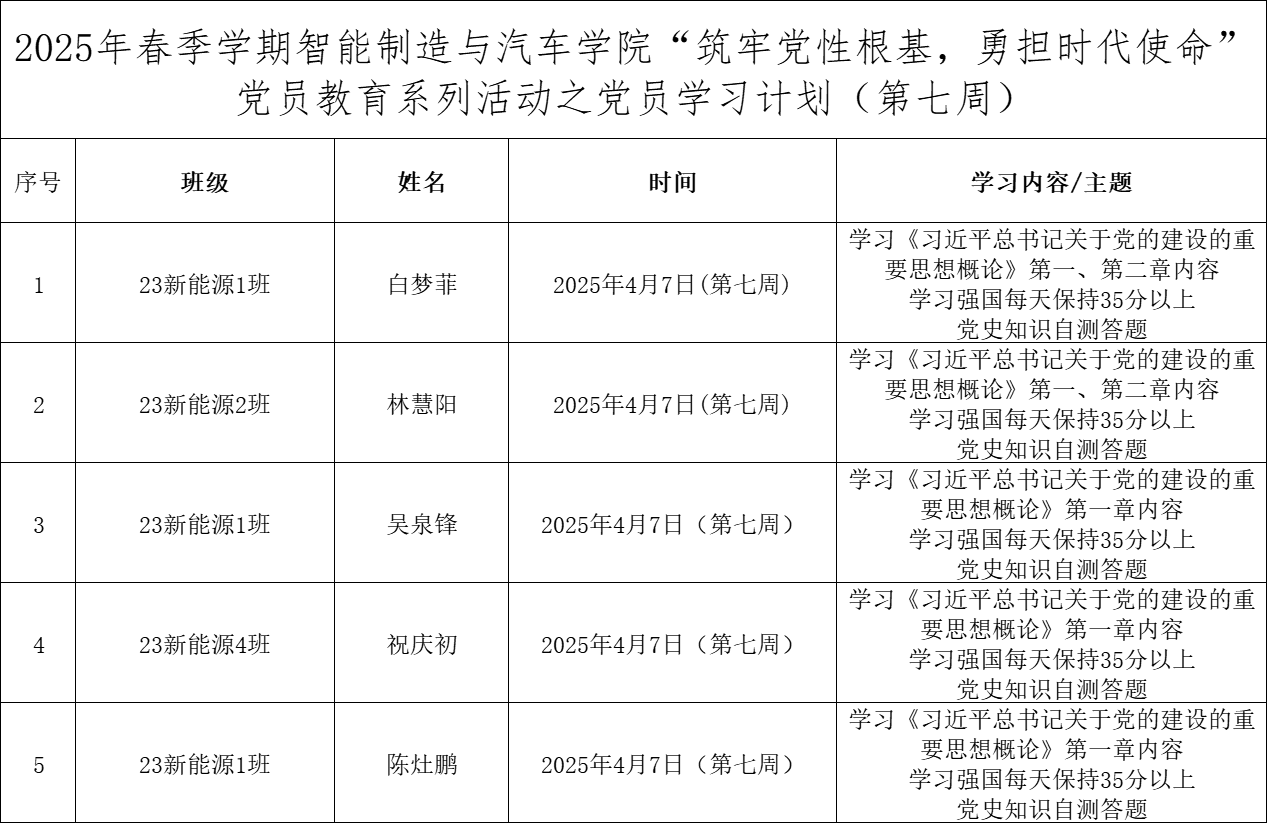 为深化党员的自我教育管理模式,切实提升党员自我教育管理实效,智能制造与汽车学院党总支针对现阶段党员教育管理不足现状,积极探索,组织开展党员自我教育学习活动,锚定学习目标,认真贯彻落实,狠抓推进整改,抓好奖励惩罚。现将第七周党员学习计划及检查结果公布如下: