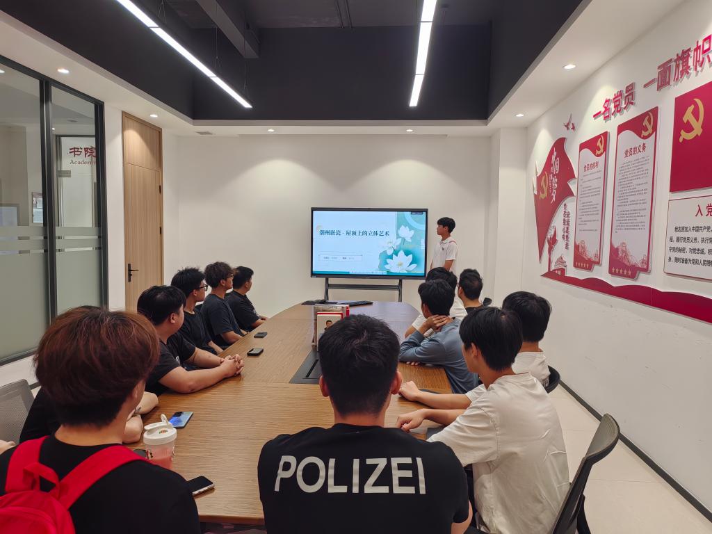 活动开始,主讲人赖俊峰同学带领大家回溯了嵌瓷的悠久历史,从其起源于唐宋时期利用破碎陶瓷片装饰建筑的早期实践,讲到明清时期工艺的成熟与在祠堂庙宇上的广泛应用。进入近现代,嵌瓷技艺在民间艺人的传承下愈发精美,题材更加丰富,并于2008年被列入国家级非物质文化遗产名录,彰显了其重要的文化价值。