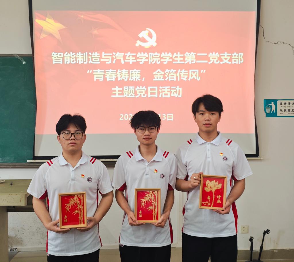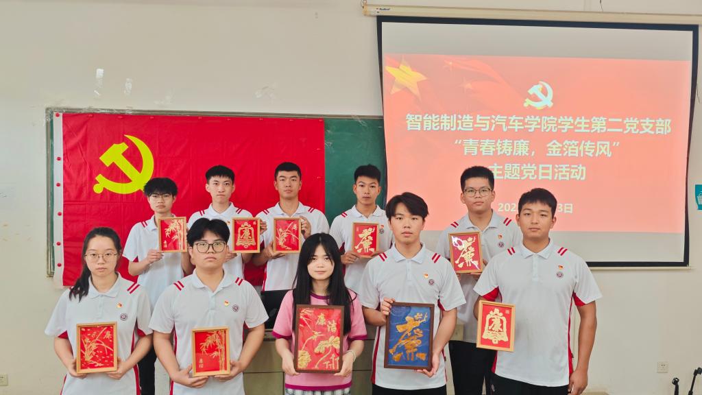 为深化党风廉政建设,筑牢党员思想根基,2025年6月11日,智能制造与汽车学院第二党支部在博学楼C507课室开展“青春铸廉,金箔传风”主题党日活动。智能制造与汽车学院党总支宣传委员、学生第二党支部书记周杨同志以及全体学生党员参加此次活动。