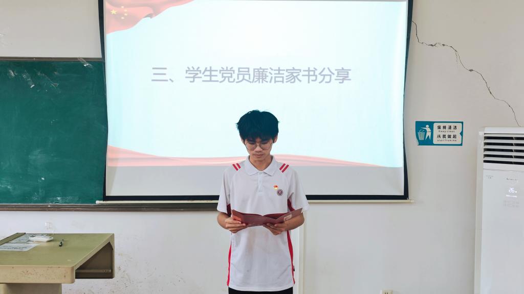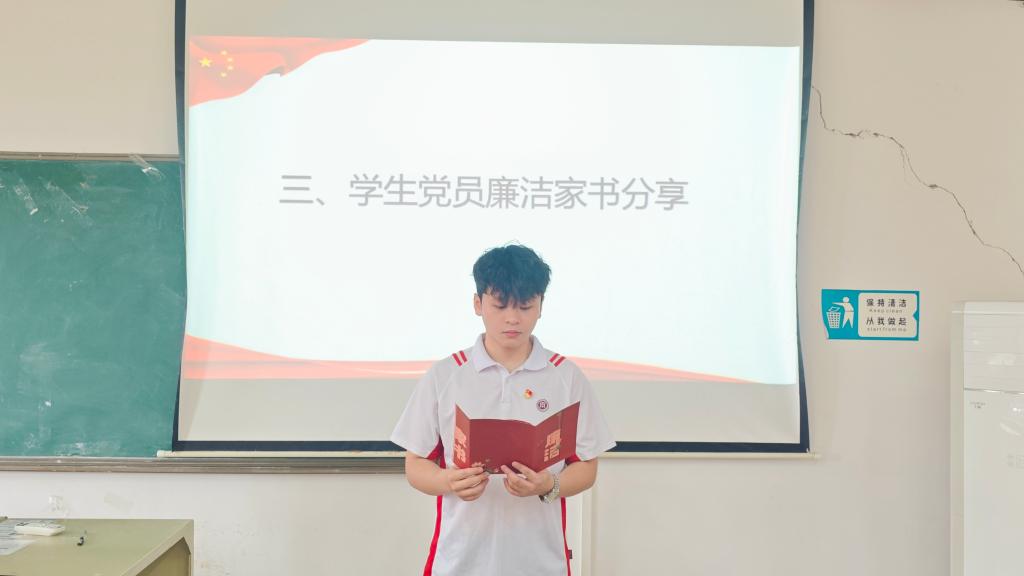 然后,学生党员依次上台分享撰写的廉洁家书。他们通过结合自身经历与近期学习,分享对廉洁内涵的深刻感悟并表示会做到不断筑牢廉洁防线,共同营造清正廉洁的家庭环境、校园环境,为推动学院事业高质量发展贡献自己的一份力量。