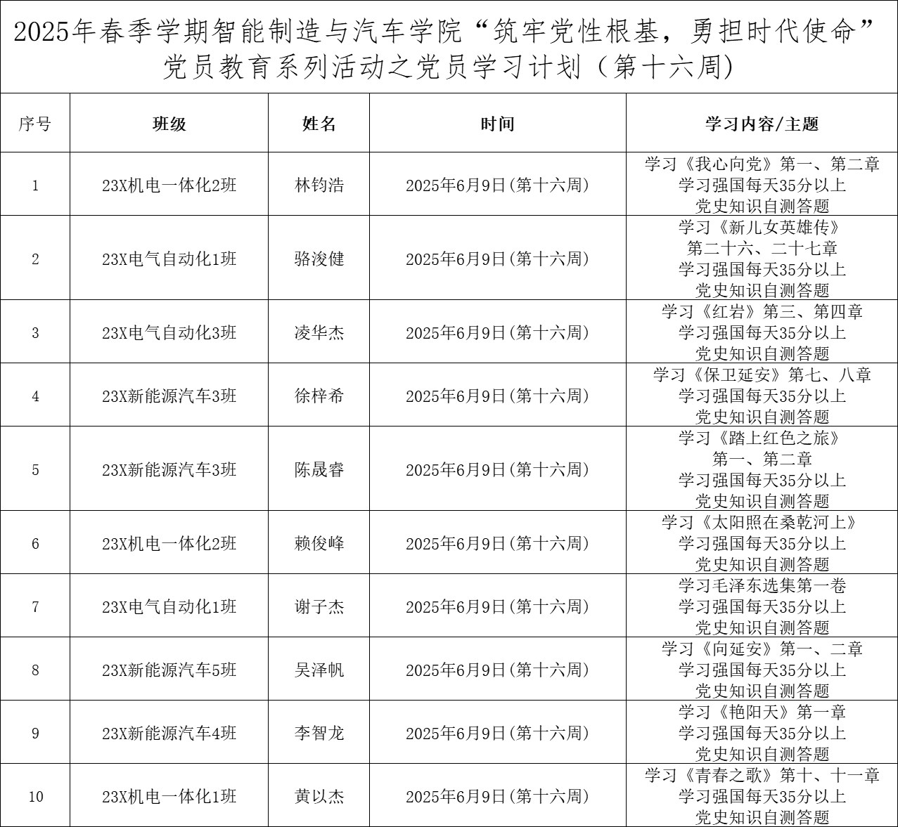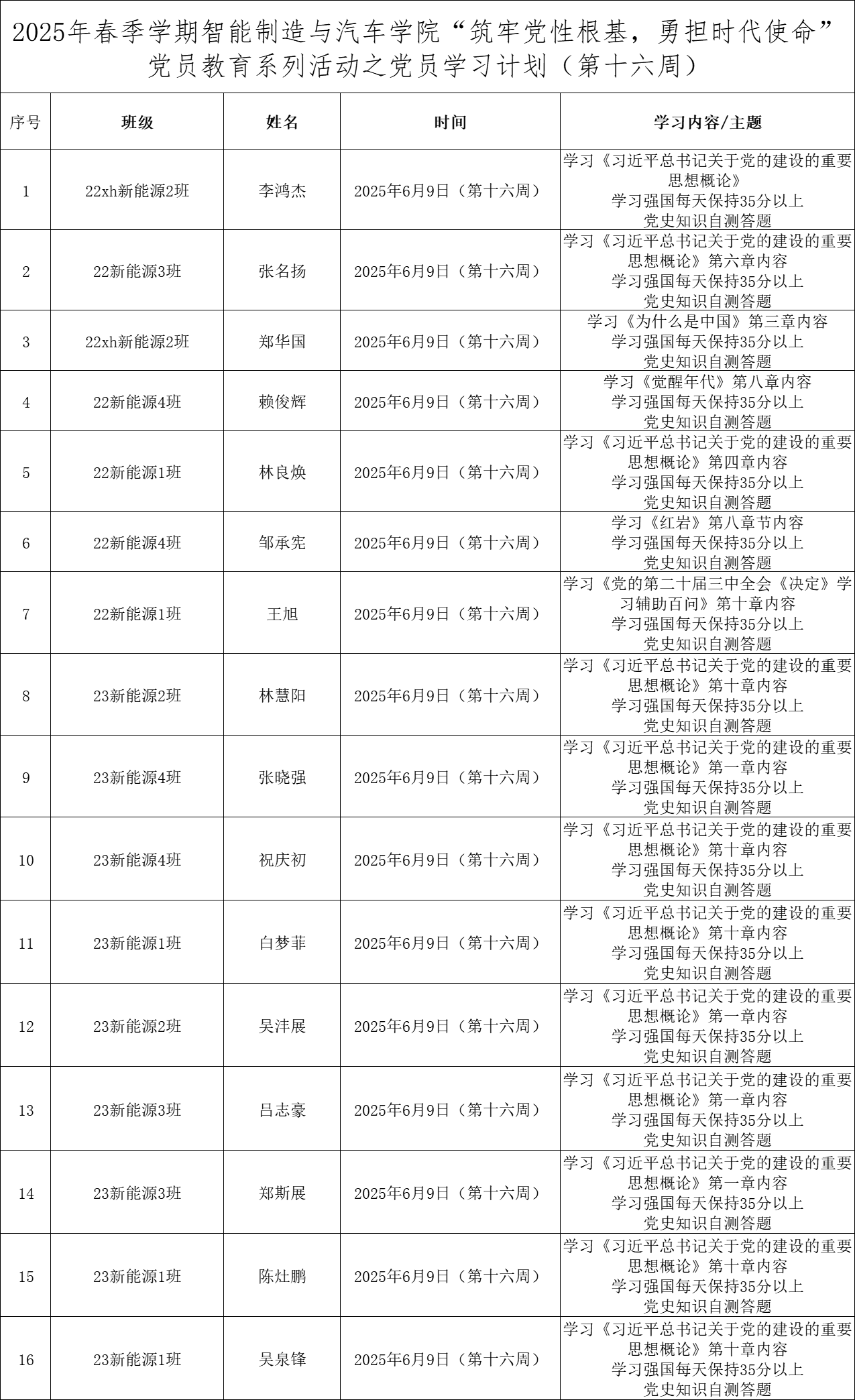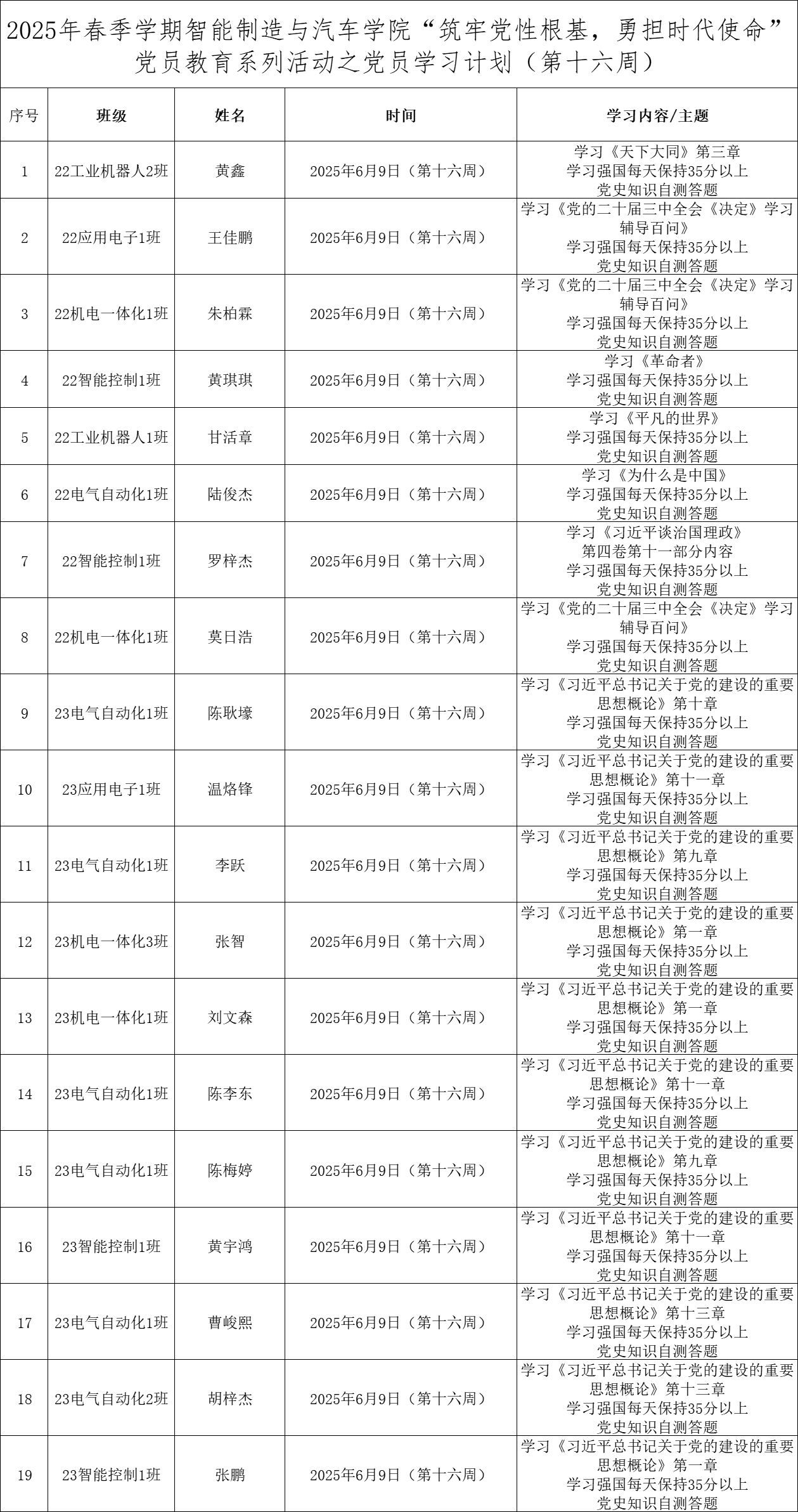 为深化党员的自我教育管理模式,切实提升党员自我教育管理实效,智能制造与汽车学院党总支针对现阶段党员教育管理不足现状,积极探索,组织开展党员自我教育学习活动,锚定学习目标,认真贯彻落实,狠抓推进整改,抓好奖励惩罚。现将第十六周党员学习计划及检查结果公布如下: