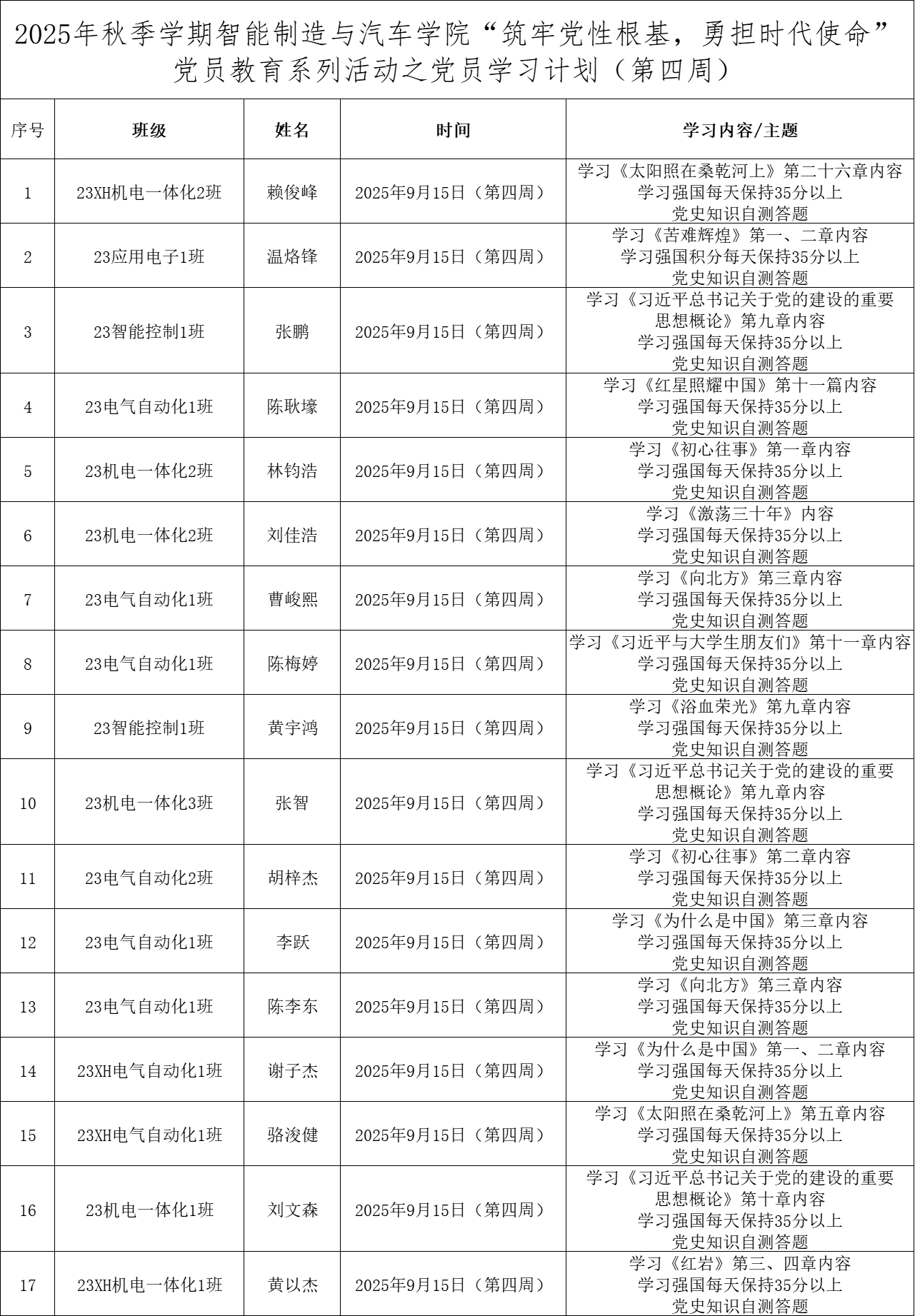 为深化党员的自我教育管理模式,切实提升党员自我教育管理实效,智能制造与汽车学院党总支针对现阶段党员教育管理不足现状,积极探索,组织开展党员自我教育学习活动,锚定学习目标,认真贯彻落实,狠抓推进整改,抓好奖励惩罚。现将第四周党员学习计划及检查结果公布如下: