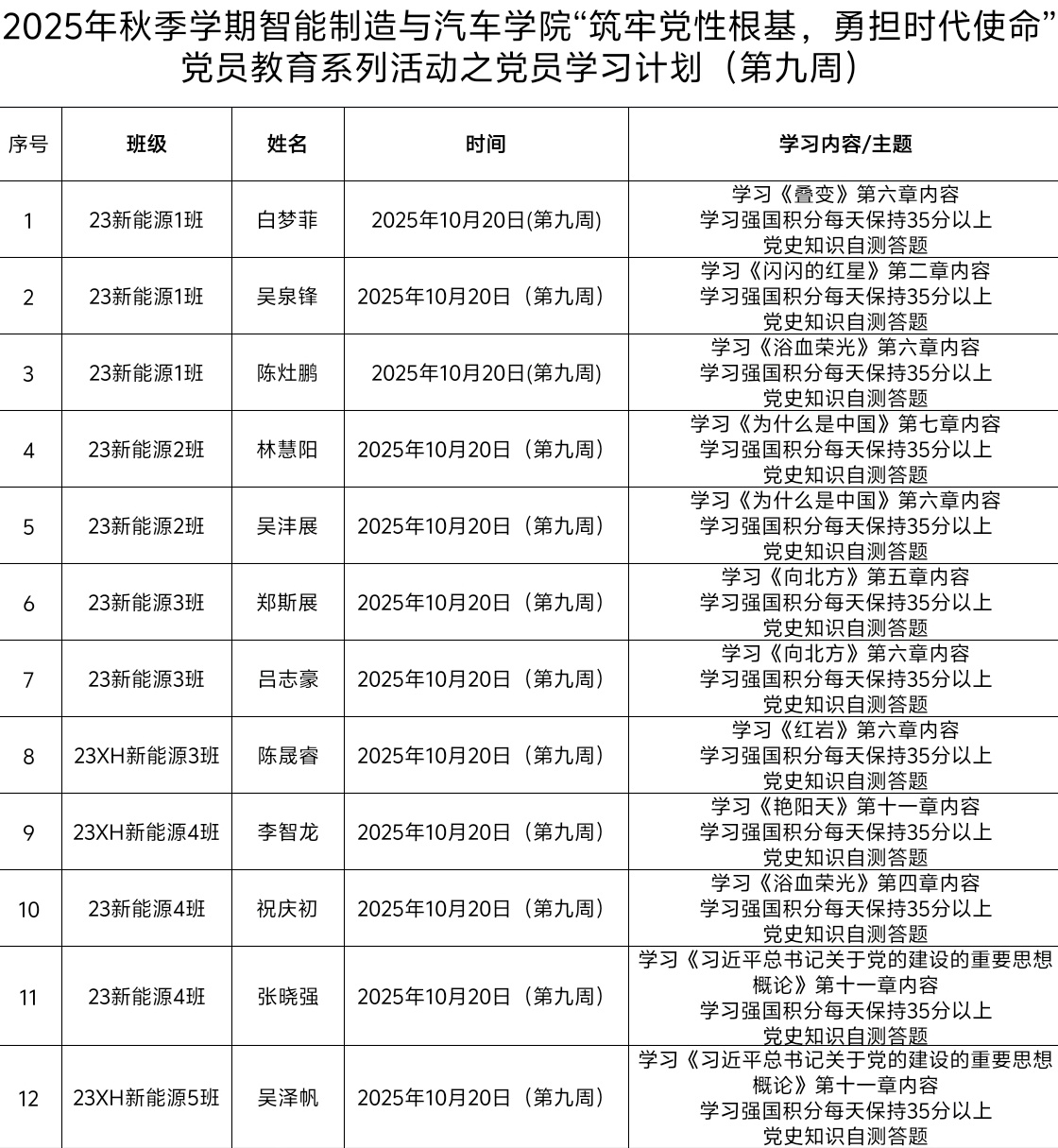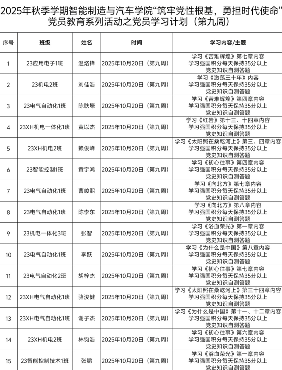 为深化党员的自我教育管理模式,切实提升党员自我教育管理实效,智能制造与汽车学院党总支针对现阶段党员教育管理不足现状,积极探索,组织开展党员自我教育学习活动,锚定学习目标,认真贯彻落实,狠抓推进整改,抓好奖励惩罚。现将第八周党员学习计划及检查结果公布如下: