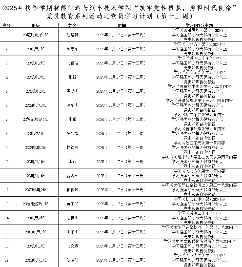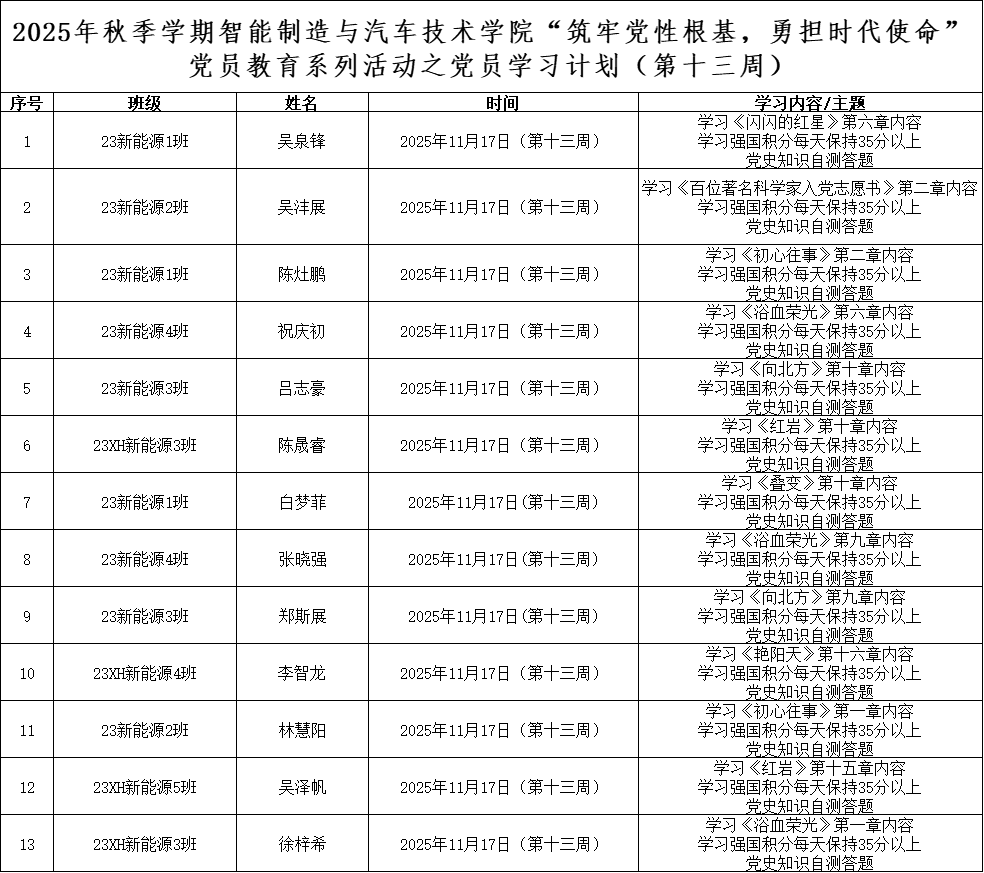 为深化党员的自我教育管理模式,切实提升党员自我教育管理实效,智能制造与汽车技术学院党总支针对现阶段党员教育管理不足现状,积极探索,组织开展党员自我教育学习活动,锚定学习目标,认真贯彻落实,狠抓推进整改,抓好奖励惩罚。现将第十三周党员学习计划及检查结果公布如下:
