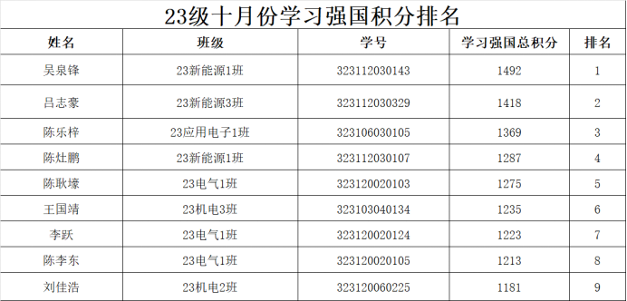 为进一步加大“学习强国”学习平台的宣传推广力度,充分发挥平台的引领作用,深入学习贯彻党的二十届三中全会精神,营造真学、深学、细学的学习氛围,智能制造与汽车学院以“学习强国”积分情况为依据,每月持续推出学习强国积分排行榜,对学习积分优秀的同学进行亮晒,推动“学习强国”学习教育在我院走深、走实、走心,掀起“学思践悟强担当,勇毅前行建新功”的热潮。