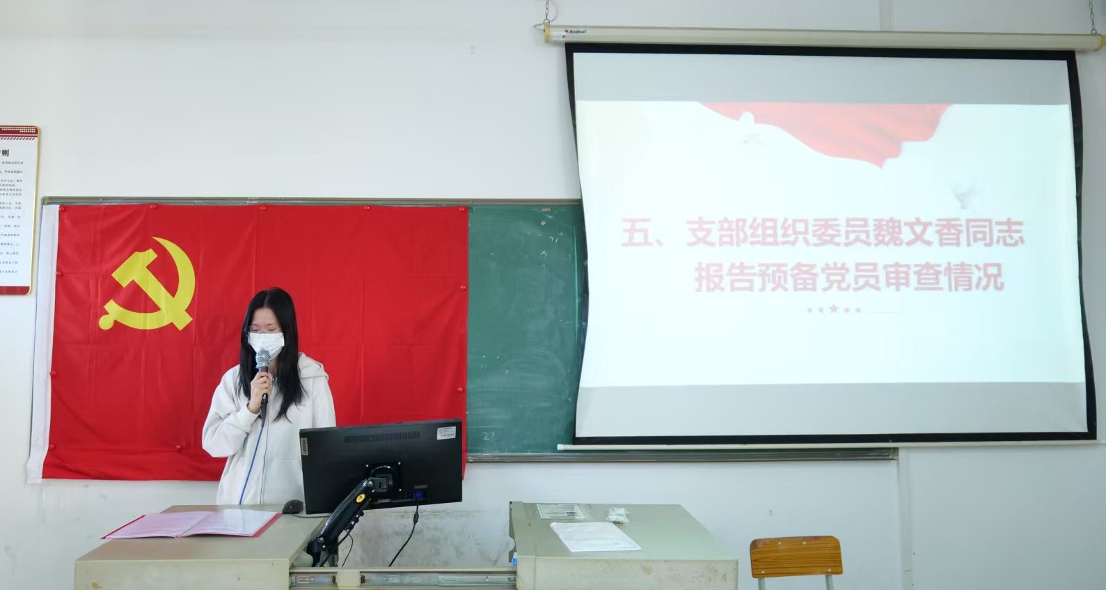 大会第五项议程,学生第二党支部组织委员魏文香同志报告对预备党员的审查情况。经支部委员会对陈灶鹏等6名预备党员审查,陈灶鹏等6名同志在预备期间,政治立场坚定,不断强化党的理论知识学习,积极参与党组织各项活动。日常中以党员标准严格自我要求,在思想、言行上始终与党组织保持一致,经培养考察,各方面表现均符合要求,已基本具备正式党员的条件。