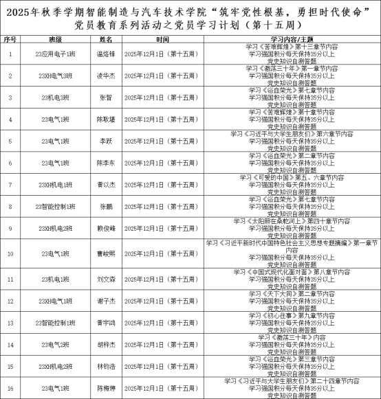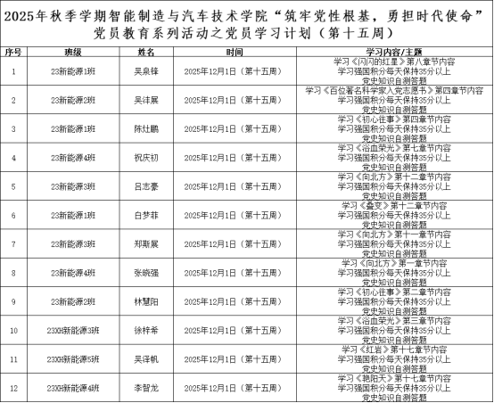 为深化党员的自我教育管理模式,切实提升党员自我教育管理实效,智能制造与汽车技术学院党总支针对现阶段党员教育管理不足现状,积极探索,组织开展党员自我教育学习活动,锚定学习目标,认真贯彻落实,狠抓推进整改,抓好奖励惩罚。现将第十五周党员学习计划及检查结果公布如下:
