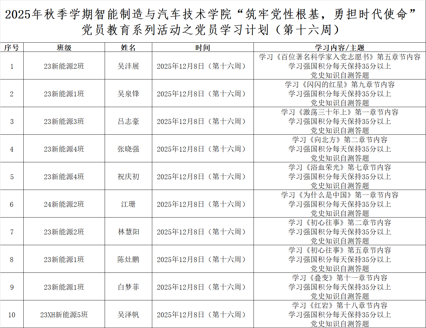 为深化党员的自我教育管理模式,切实提升党员自我教育管理实效,智能制造与汽车技术学院党总支针对现阶段党员教育管理不足现状,积极探索,组织开展党员自我教育学习活动,锚定学习目标,认真贯彻落实,狠抓推进整改,抓好奖励惩罚。现将第十六周党员学习计划及检查结果公布如下: